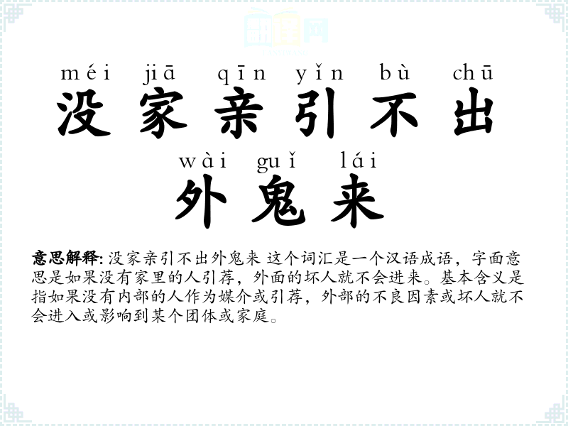 没家亲引不出外鬼来 这个词汇是一个汉语成语,字面意思是如果没有家里的人引荐,外面的坏人就不会进来。基本含义是指如果没有内部的人作为媒介或引荐,外部的不良因素或坏人就不会进入或影响到某个团体或家庭。