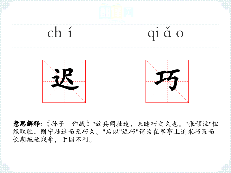 ,未睹巧之久也。"张预注"但能取胜,则宁拙速而无巧久。"后以"迟巧"谓为在军事上追求巧策而长期拖延战争,于国不利。