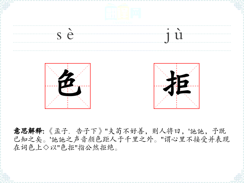 《孟子.告子下》"夫苟不好善,则人将曰,'訑訑,予既已知之矣。'訑訑之声音颜色距人于千里之外。"谓心里不接受并表现在词色上◇以"色拒"指公然拒绝。