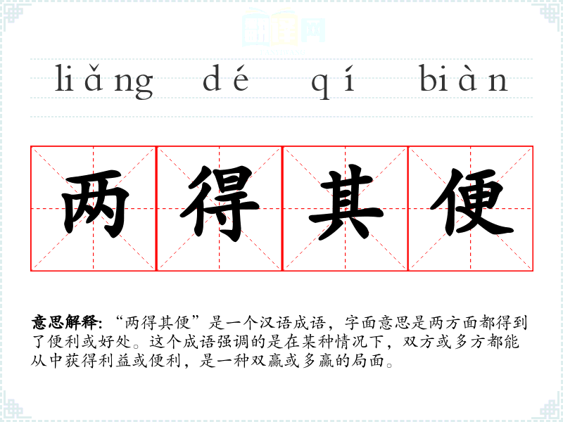 “两得其便”是一个汉语成语,字面意思是两方面都得到了便利或好处。这个成语强调的是在某种情况下,双方或多方都能从中获得利益或便利,是一种双赢或多赢的局面。