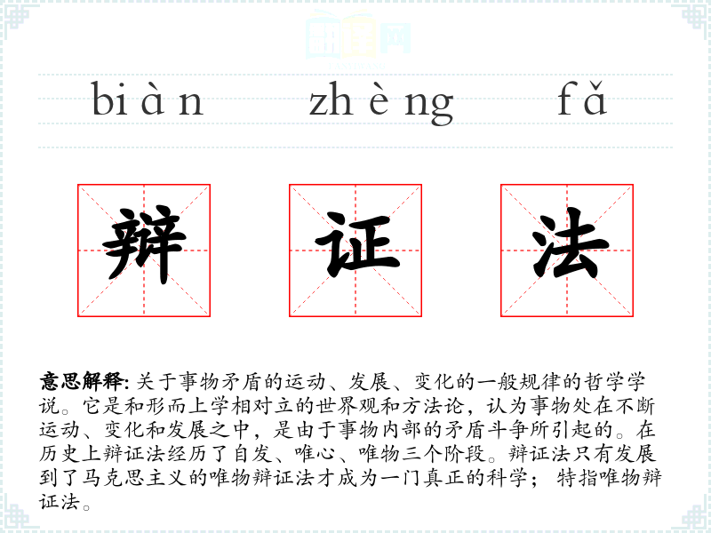 1.关于事物矛盾的运动、发展、变化的一般规律的哲学学说。它是和形而上学相对立的世界观和方法论,认为事物处在不断运动、变化和发展之中,是由于事物内部的矛盾斗争所引起的。在历史上辩证法经历了自发、唯心、唯物三个阶段。辩证法只有发展到了马克思主义的唯物辩证法才成为一门真正的科学; 特指唯物辩证法。
