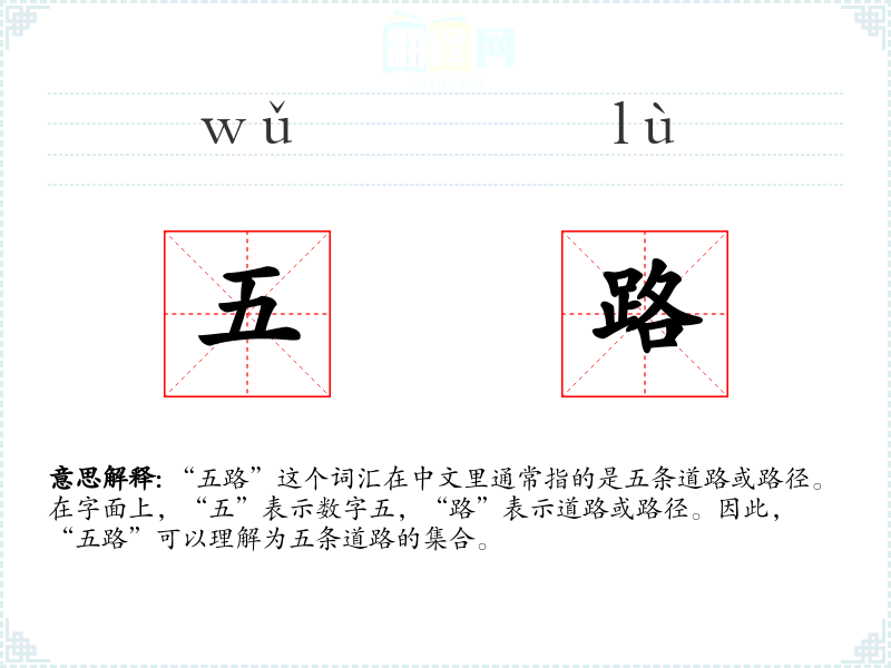 “五路”这个词汇在中文里通常指的是五条道路或路径。在字面上,“五”表示数字五,“路”表示道路或路径。因此,“五路”可以理解为五条道路的集合。