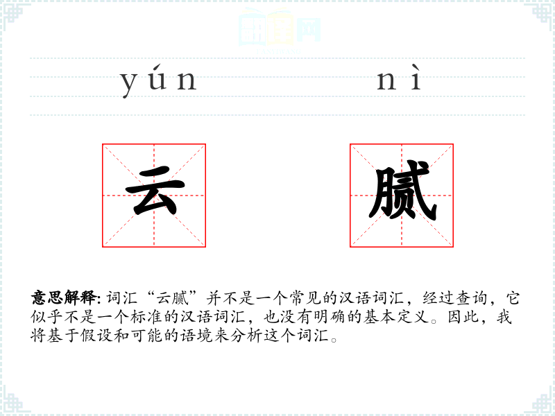 词汇“云腻”并不是一个常见的汉语词汇,经过查询,它似乎不是一个标准的汉语词汇,也没有明确的基本定义。因此,我将基于假设和可能的语境来分析这个词汇。