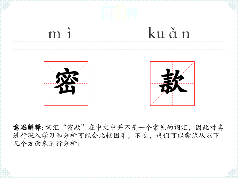 词汇“密款”在中文中并不是一个常见的词汇,因此对其进行深入学习和分析可能会比较困难。不过,我们可以尝试从以下几个方面来进行分析: