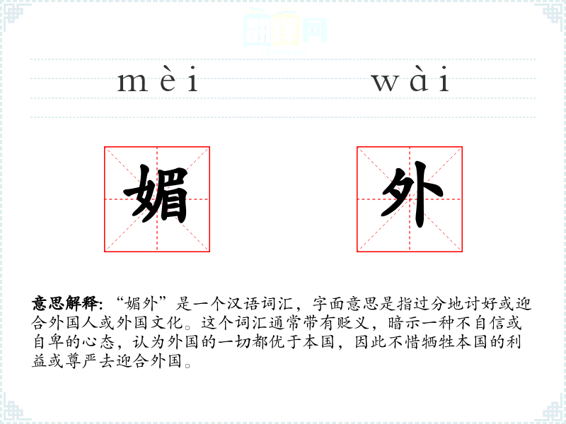 “媚外”是一个汉语词汇,字面意思是指过分地讨好或迎合外国人或外国文化。这个词汇通常带有贬义,暗示一种不自信或自卑的心态,认为外国的一切都优于本国,因此不惜牺牲本国的利益或尊严去迎合外国。