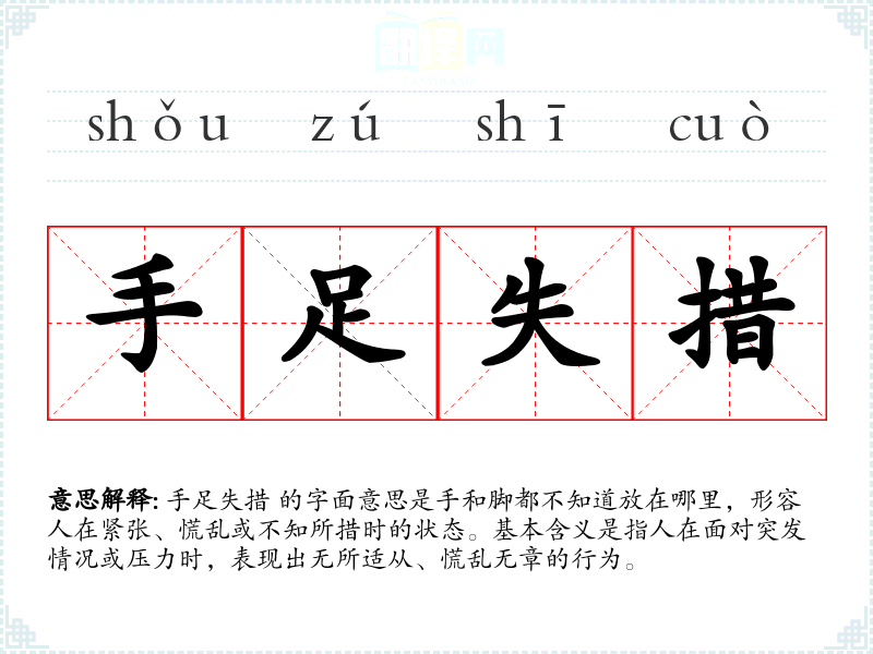 手足失措 的字面意思是手和脚都不知道放在哪里,形容人在紧张、慌乱或不知所措时的状态。基本含义是指人在面对突发情况或压力时,表现出无所适从、慌乱无章的行为。