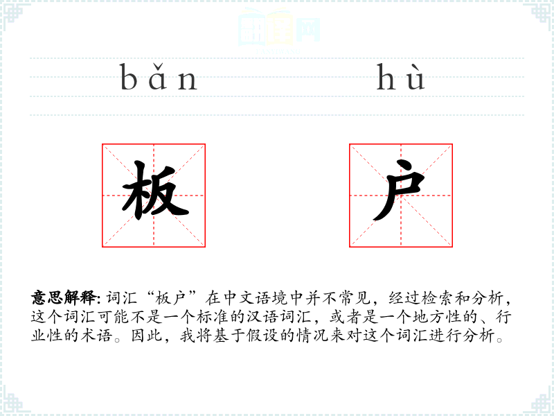 词汇“板户”在中文语境中并不常见,经过检索和分析,这个词汇可能不是一个标准的汉语词汇,或者是一个地方性的、行业性的术语。因此,我将基于假设的情况来对这个词汇进行分析。