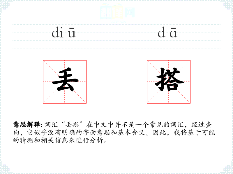 由于“丢搭”不是一个标准词汇,我们无法提供一个确切的基本定义。它可能是方言中的词汇,或者是某个特定社群中的俚语。