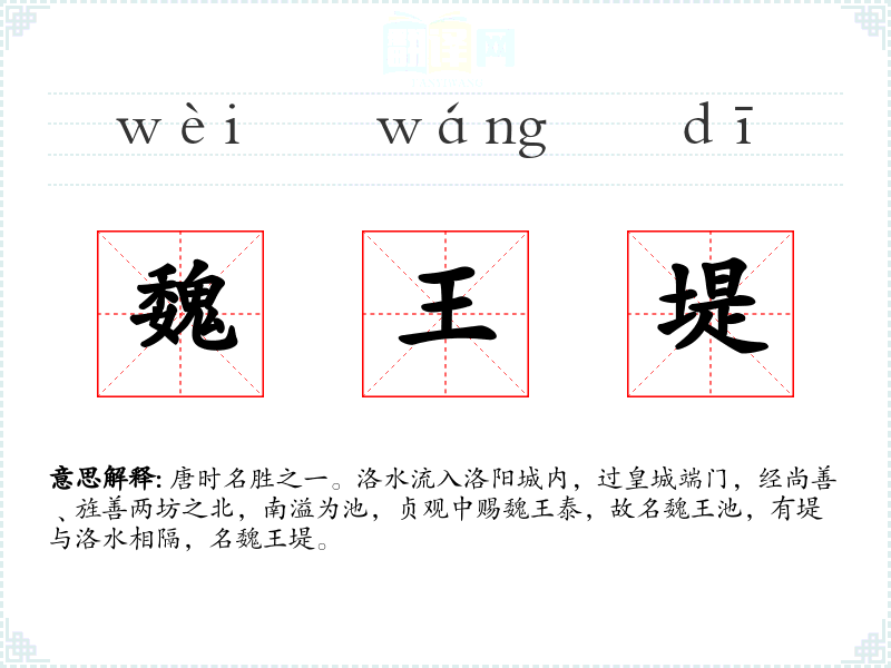 唐时名胜之一。洛水流入洛阳城内,过皇城端门,经尚善﹑旌善两坊之北,南溢为池,贞观中赐魏王泰,故名魏王池,有堤与洛水相隔,名魏王堤。