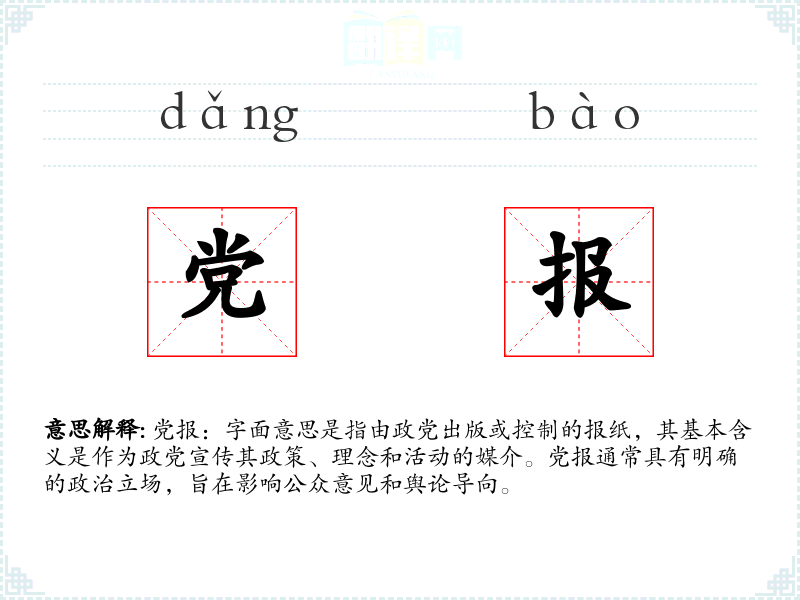 党报:字面意思是指由政党出版或控制的报纸,其基本含义是作为政党宣传其政策、理念和活动的媒介。党报通常具有明确的政治立场,旨在影响公众意见和舆论导向。