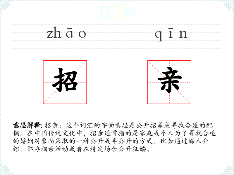 招亲:这个词汇的字面意思是公开招募或寻找合适的配偶。在**传统文化中,招亲通常指的是家庭或个人为了寻找合适的婚姻对象而采取的一种公开或半公开的方式,比如通过媒人介绍、举办相亲活动或者在特定场合公开征婚。
