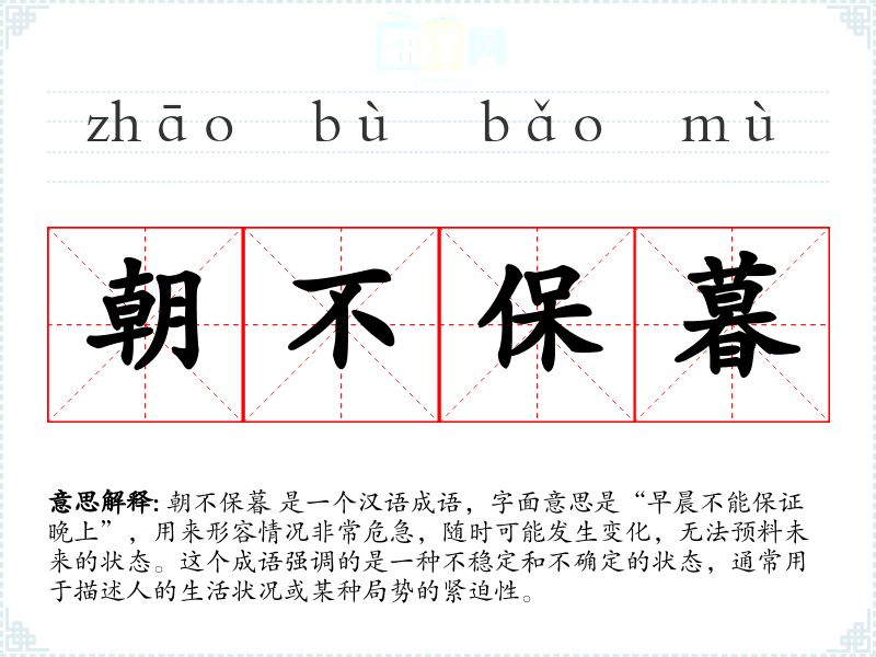 朝不保暮 是一个汉语成语,字面意思是“早晨不能保证晚上”,用来形容情况非常危急,随时可能发生变化,无法预料未来的状态。这个成语强调的是一种不稳定和不确定的状态,通常用于描述人的生活状况或某种局势的紧迫性。