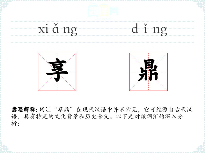 词汇“享鼎”在现代汉语中并不常见,它可能源自古代汉语,具有特定的文化背景和历史含义。以下是对该词汇的深入分析:
