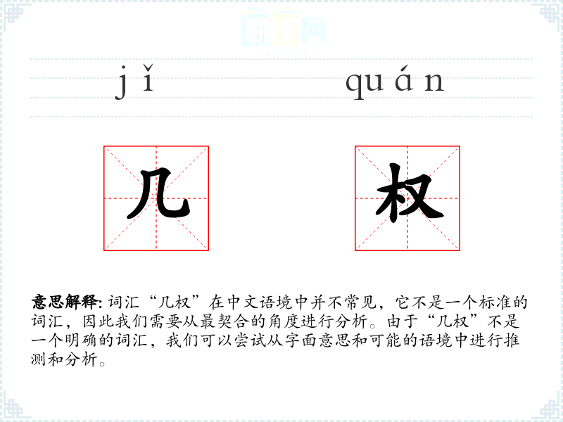 “几权”字面意思可能是指“几个权利”或“几种权力”。这里的“几”表示数量上的不确定,而“权”通常指权利或权力。
