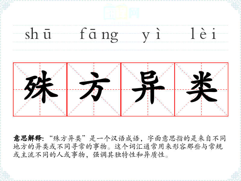 “殊方异类”是一个汉语成语,字面意思指的是来自不同地方的异类或不同寻常的事物。这个词汇通常用来形容那些与常规或主流不同的人或事物,强调其独特性和异质性。