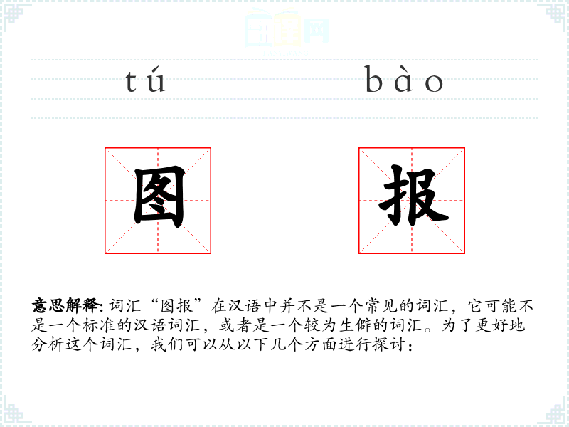 由于“图报”不是一个常见的词汇,我们无法给出一个确切的基本定义。它可能是由“图”和“报”两个字组合而成的,但具体含义需要更多的上下文信息来确定。