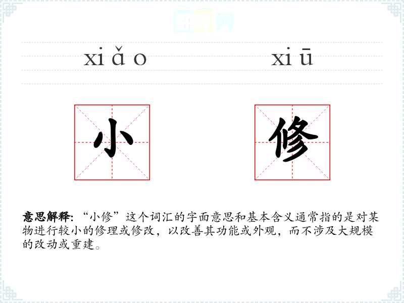 “小修”这个词汇的字面意思和基本含义通常指的是对某物进行较小的修理或修改,以改善其功能或外观,而不涉及***的改动或重建。
