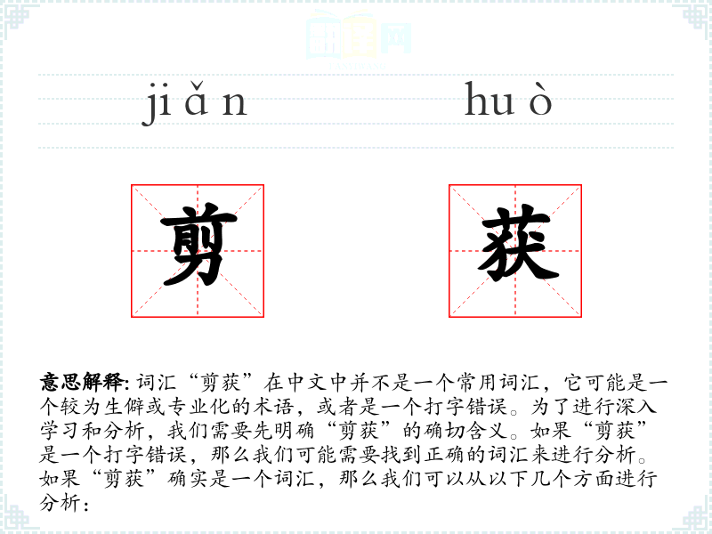 由于“剪获”不是一个常用词汇,我们无法提供一个准确的字面意思和基本含义。如果这是一个专业术语,可能需要查阅相关领域的专业词典或文献。
