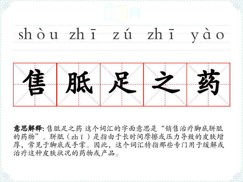 售胝足之药 这个词汇的字面意思是“销售治疗脚底胼胝的药物”。胼胝(zhī)是指由于长时间摩擦或压力导致的皮肤增厚,常见于脚底或手掌。因此,这个词汇特指那些专门用于缓解或治疗这种皮肤状况的药物或产品。