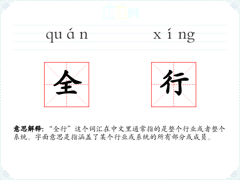 “全行”这个词汇在中文里通常指的是整个行业或者整个系统。字面意思是指涵盖了某个行业或系统的所有部分或成员。