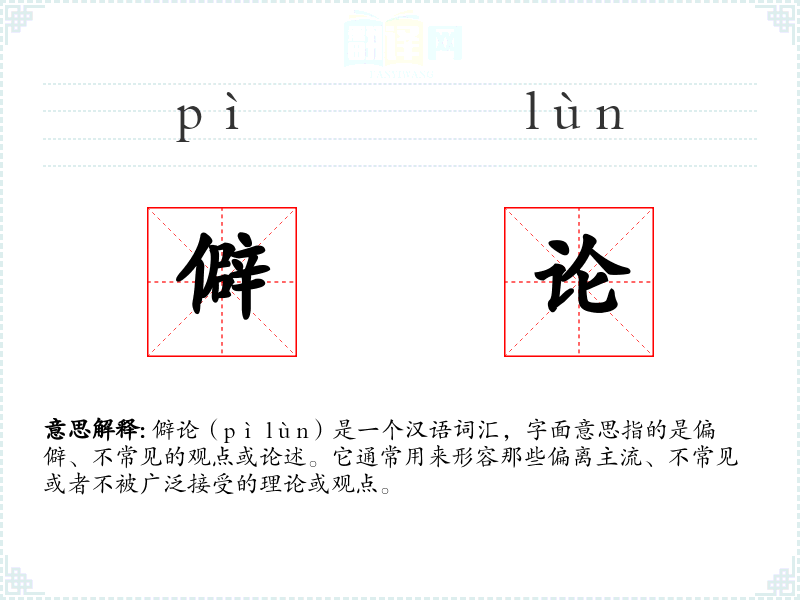 僻论(pì lùn)是一个汉语词汇,字面意思指的是偏僻、不常见的观点或论述。它通常用来形容那些偏离主流、不常见或者不被广泛接受的理论或观点。