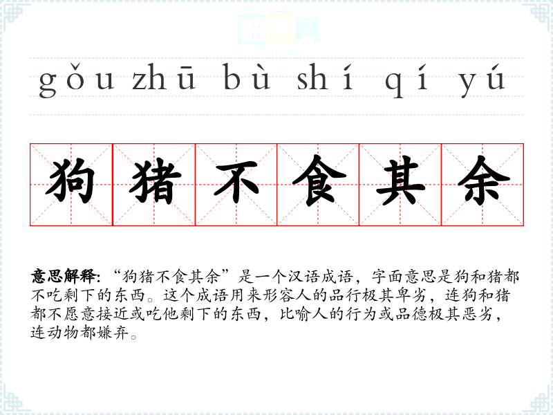 “狗猪不食其余”是一个汉语成语,字面意思是狗和猪都不吃剩下的东西。这个成语用来形容人的品行极其卑劣,连狗和猪都不愿意接近或吃他剩下的东西,比喻人的行为或品德极其恶劣,连动物都嫌弃。