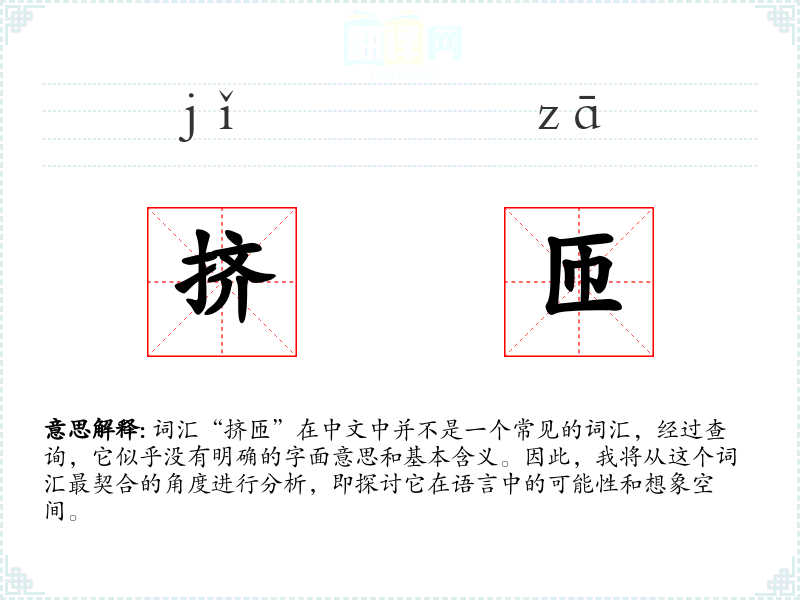 由于“挤匝”不是一个标准的汉语词汇,我们无法给出一个确切的基本定义。它可能是方言词汇或者是某个特定社群中的俚语,但由于缺乏具体信息,我们无法准确解释其含义。