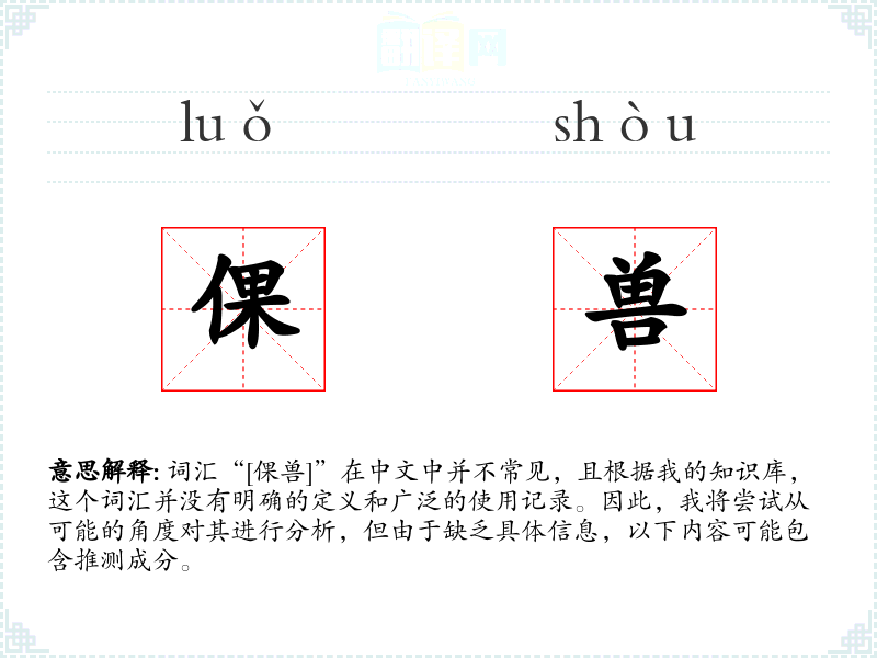 词汇“[倮兽]”在中文中并不常见,且根据我的知识库,这个词汇并没有明确的定义和广泛的使用记录。因此,我将尝试从可能的角度对其进行分析,但由于缺乏具体信息,以下内容可能包含推测成分。