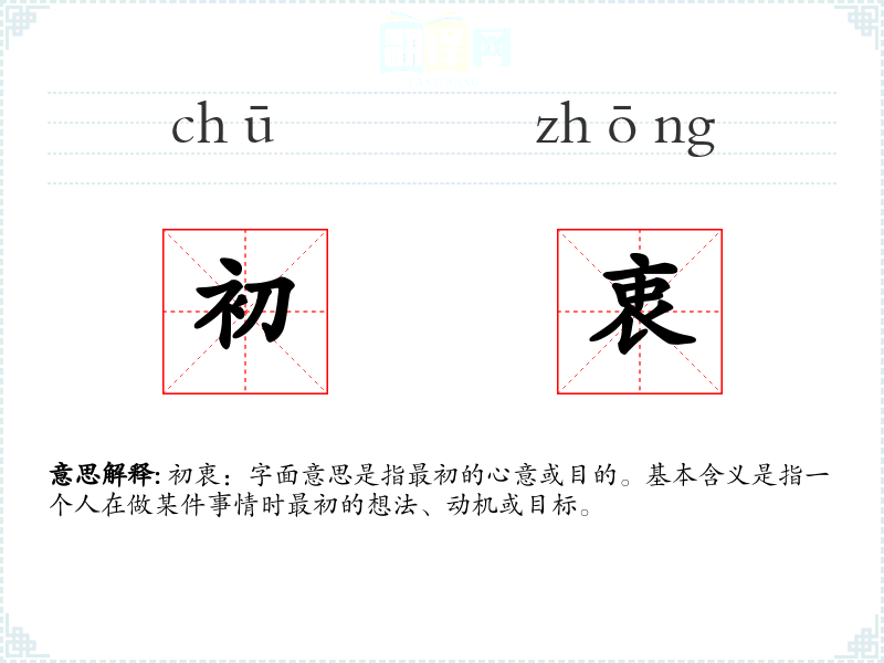 初衷:字面意思是指最初的心意或目的。基本含义是指一个人在做某件事情时最初的想法、动机或目标。