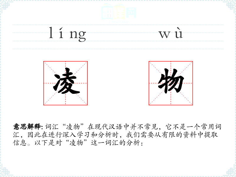 词汇“凌物”在现代汉语中并不常见,它不是一个常用词汇,因此在进行深入学*和分析时,我们需要从有限的资料中提取信息。以下是对“凌物”这一词汇的分析: