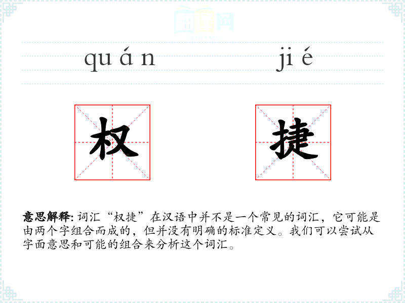 词汇“权捷”在汉语中并不是一个常见的词汇,它可能是由两个字组合而成的,但并没有明确的标准定义。我们可以尝试从字面意思和可能的组合来分析这个词汇。