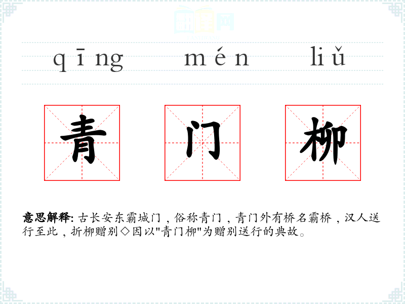 古长安东霸城门﹐俗称青门﹐青门外有桥名霸桥﹐汉人送行至此﹐折柳赠别◇因以"青门柳"为赠别送行的典故。