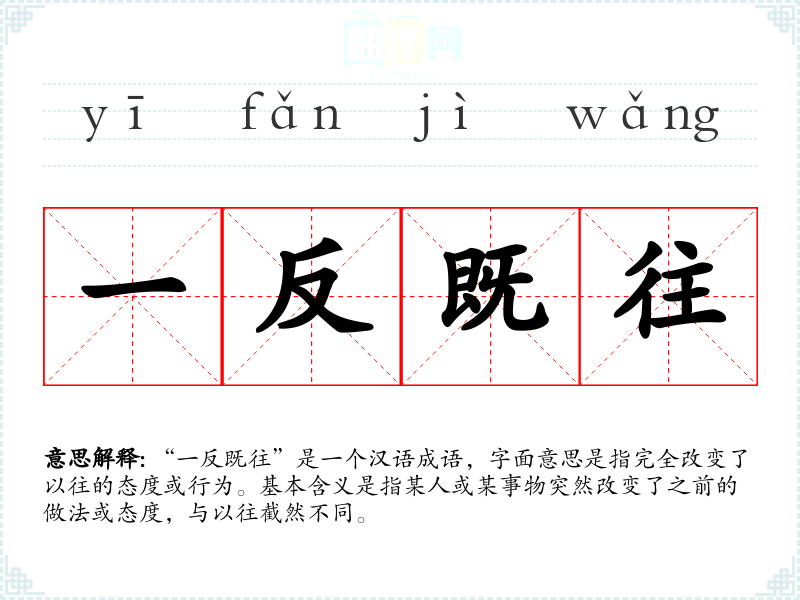“一反既往”是一个汉语成语,字面意思是指完全改变了以往的态度或行为。基本含义是指某人或某事物突然改变了之前的做法或态度,与以往截然不同。