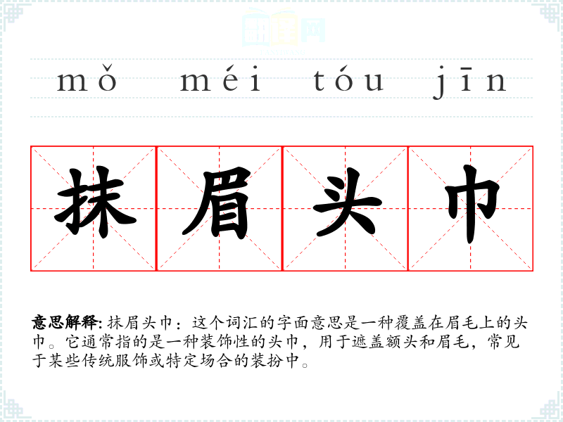 抹眉头巾:这个词汇的字面意思是一种覆盖在眉毛上的头巾。它通常指的是一种装饰性的头巾,用于遮盖额头和眉毛,常见于某些传统服饰或特定场合的装扮中。