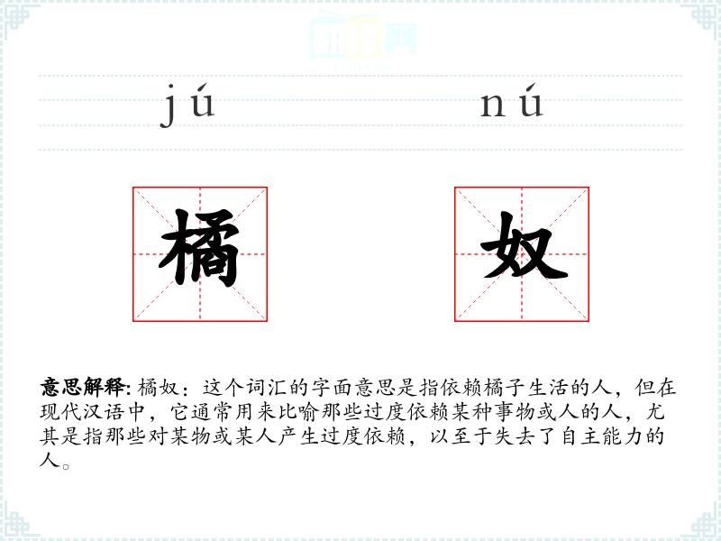 橘奴:这个词汇的字面意思是指依赖橘子生活的人,但在现代汉语中,它通常用来比喻那些过度依赖某种事物或人的人,尤其是指那些对某物或某人产生过度依赖,以至于失去了自主能力的人。