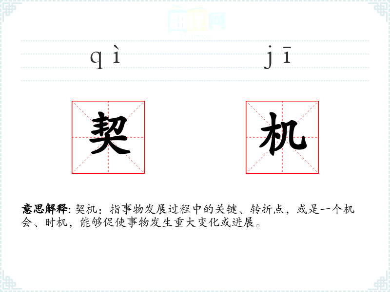契机:指事物发展过程中的关键、转折点,或是一个机会、时机,能够促使事物发生重大变化或进展。