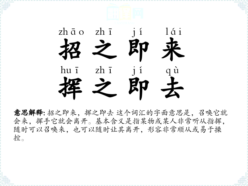 招之即来,挥之即去 这个词汇的字面意思是,召唤它就会来,挥手它就会离开。基本含义是指某物或某人非常听从指挥,随时可以召唤来,也可以随时让其离开,形容非常顺从或易于操控。