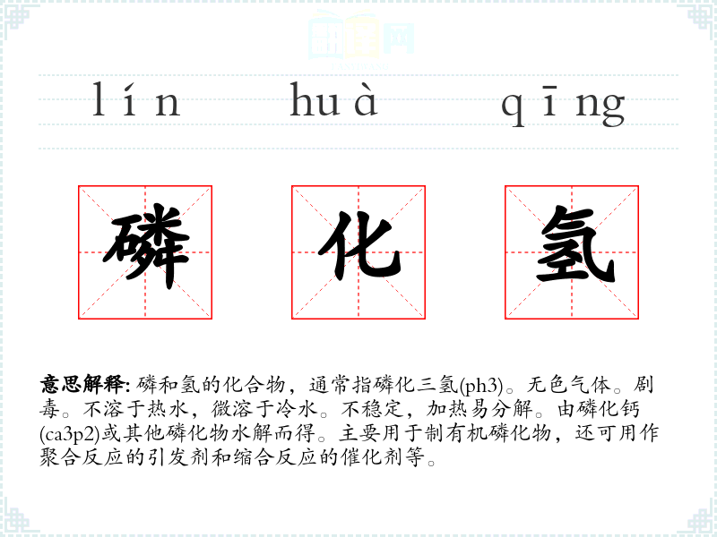 1.磷和氢的化合物,通常指磷化三氢(ph3)。无色气体。剧毒。不溶于热水,微溶于冷水。不稳定,加热易分解。由磷化钙(ca3p2)或其他磷化物水解而得。主要用于制有机磷化物,还可用作聚合反应的引发剂和缩合反应的催化剂等。