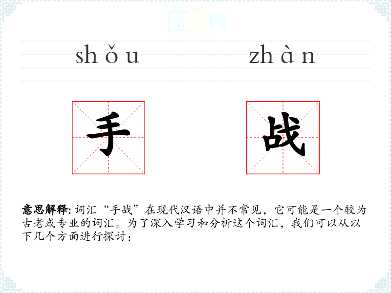 词汇“手战”在现代汉语中并不常见,它可能是一个较为古老或专业的词汇。为了深入学*和分析这个词汇,我们可以从以下几个方面进行探讨: