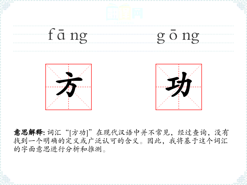 词汇“[方功]”在现代汉语中并不常见,经过查询,没有找到一个明确的定义或广泛认可的含义。因此,我将基于这个词汇的字面意思进行分析和推测。