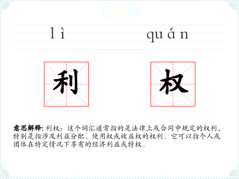 利权:这个词汇通常指的是法律上或合同中规定的权利,特别是指涉及利益分配、使用权或收益权的权利。它可以指个人或团体在特定情况下享有的经济利益或特权。