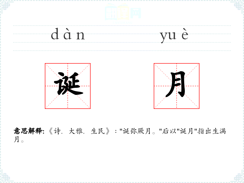 《诗.大雅.生民》﹕"诞弥厥月。"后以"诞月"指出生满月。