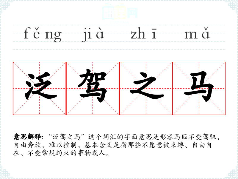 “泛驾之马”这个词汇的字面意思是形容马匹不受驾驭,自由奔放,难以控制。基本含义是指那些不愿意被束缚、自由自在、不受常规约束的事物或人。