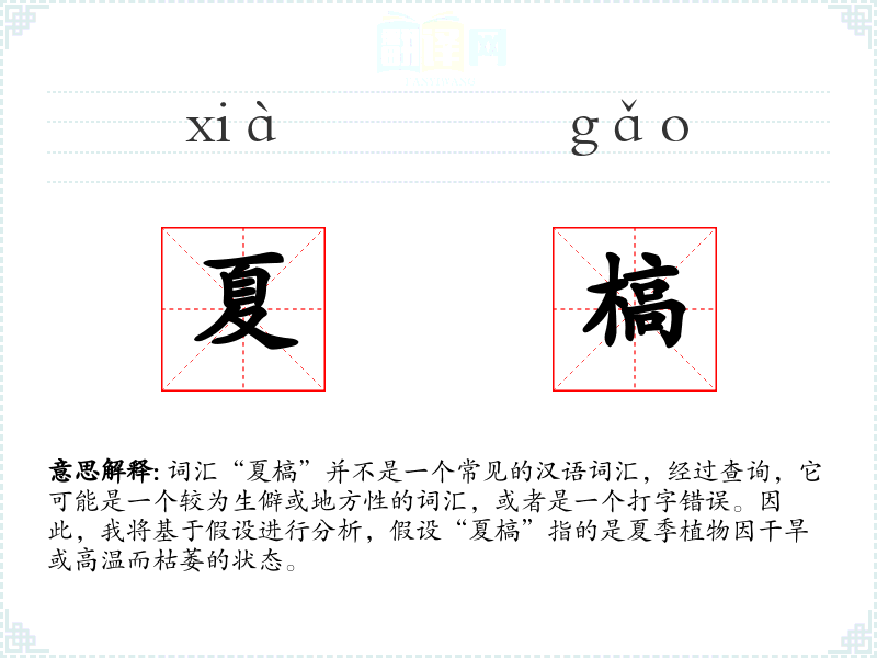 “夏槁”字面意思是指在夏季由于缺水或高温导致的植物枯萎状态。其中,“夏”指的是夏季,“槁”则意味着枯萎或干枯。