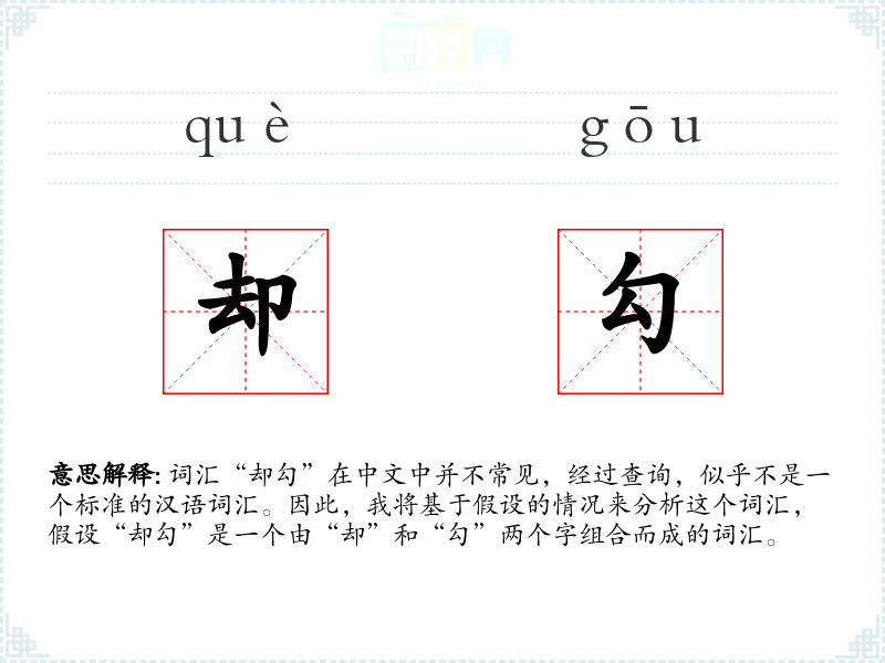 词汇“却勾”在中文中并不常见,经过查询,似乎不是一个标准的汉语词汇。因此,我将基于假设的情况来分析这个词汇,假设“却勾”是一个由“却”和“勾”两个字组合而成的词汇。