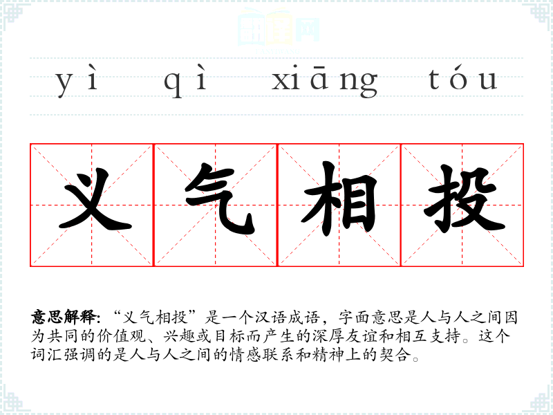 “义气相投”是一个汉语成语,字面意思是人与人之间因为共同的价值观、兴趣或目标而产生的深厚友谊和相互支持。这个词汇强调的是人与人之间的情感联系和精神上的契合。