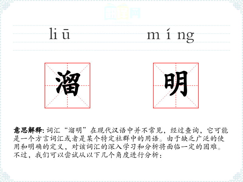 由于“溜明”不是一个标准汉语词汇,且缺乏广泛的使用和明确的定义,我们无法对该词汇进行深入的分析和总结。在语言学习和表达中,了解和使用标准汉语词汇更为重要,以确保沟通的准确性和有效性。