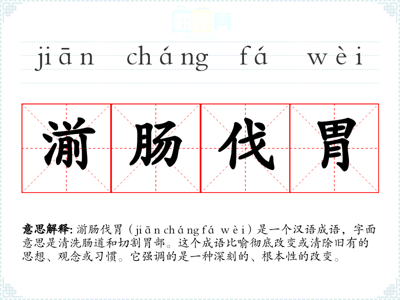 湔肠伐胃(jiān cháng fá wèi)是一个汉语成语,字面意思是清洗肠道和切割胃部。这个成语比喻彻底改变或清除旧有的思想、观念或*惯。它强调的是一种深刻的、根本性的改变。
