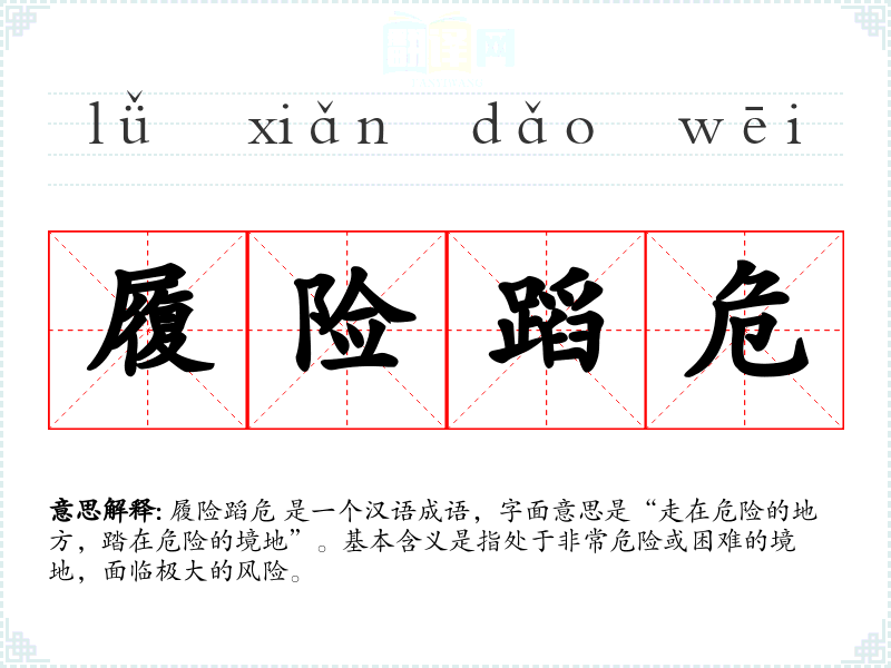 履险蹈危 是一个汉语成语,字面意思是“走在危险的地方,踏在危险的境地”。基本含义是指处于非常危险或困难的境地,面临极大的风险。
