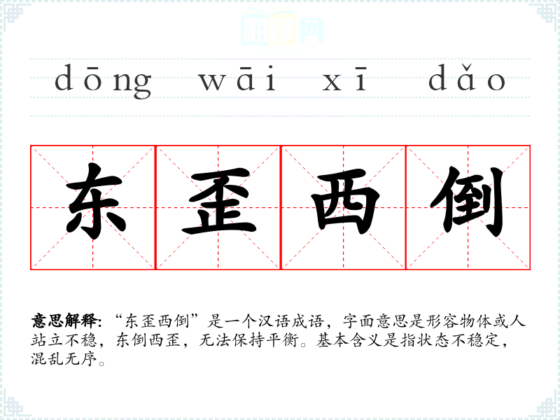 “东歪西倒”是一个汉语成语,字面意思是形容物体或人站立不稳,东倒西歪,无法保持平衡。基本含义是指状态不稳定,混乱无序。